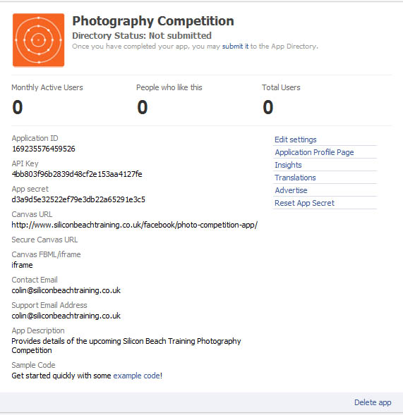 Hit Save Changes and hey-presto - you've created a Facebook iFrame App, and will be taken to a page summarising the details.
