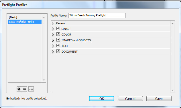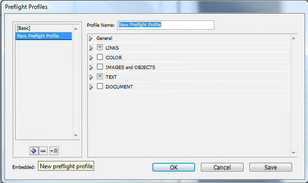 This is a very useful tool and you can customise it to include checking a mix of links, colours, images and objects, text and the whole document itself. It is a great way of checking the make sure all the different elements are the right size, type etc. To add a new profile simply click - the downward arrow at the bottom of the page then click on – Define Profiles, you then need to click the – New Preflight Profile, after that you can rename the Profile and select all the boxes you desire to have checked, and then click – OK.