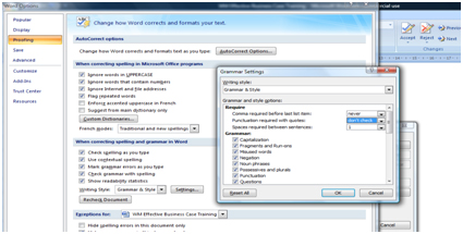 In the ‘proofing’section of the Word Options menu, you can select grammar and style settings as well as spelling. These include checks on number formats, wordiness, incomplete sentences, and when to use ‘that’ or ‘which’, for example. Even how many spaces between sentences.