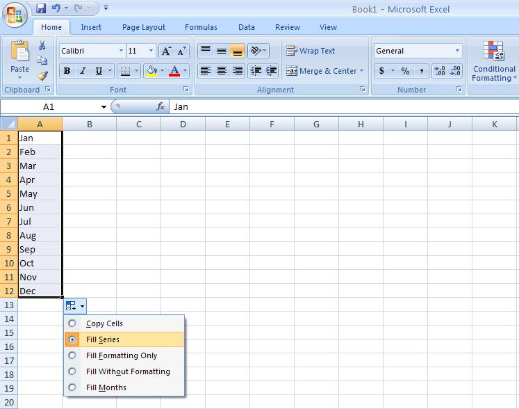 If you click on this a drop down menu will appear showing you a list of further options. Whatever you press in this drop down menu will affect the series of numbers that you have created. If you would rather not have Excel type out all of the months and want all of the cells to say January, use the “copy cells” option