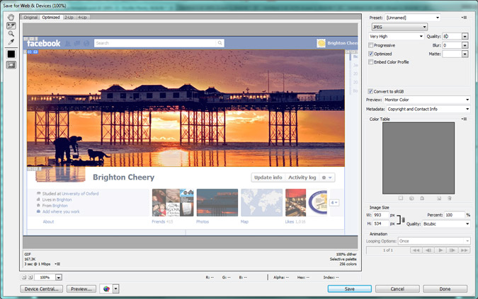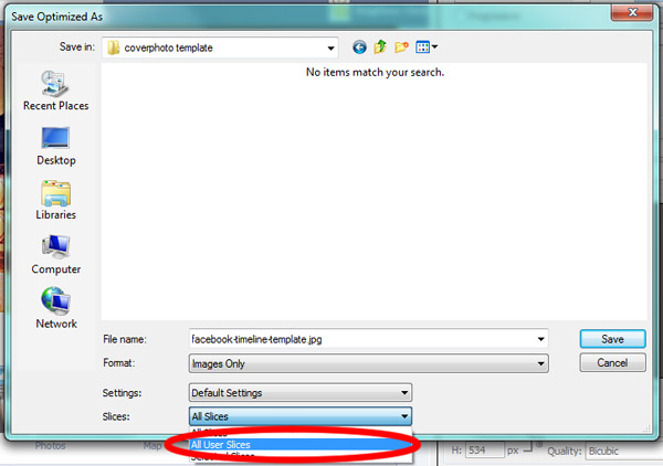 The window shows you which part of the file will save. Because we have sliced the dimensions of the cover photo already this is the only part of the template that will be saved.