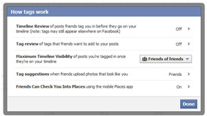 While you are on the How You Connect screen it would be a good time to take a look at the How Tags Work section, where you will be greeted by another pop up (again, shown below). By changing the Maximum Timeline Visibility you can control who sees post you are tagged in. If none of the default options meet your requirements then select Custom to specify specific people or lists you don’t want seeing the posts, or alternatively select Only Me to completely lockdown who can post on your Timeline.