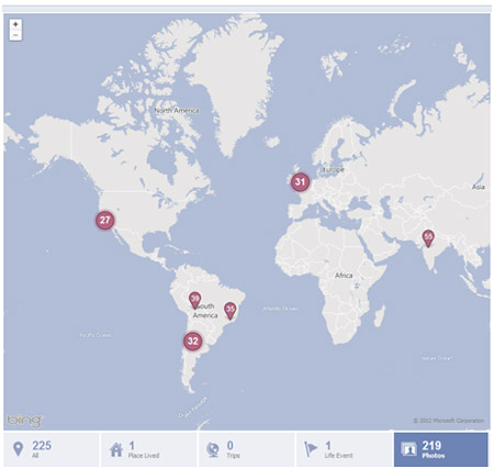 You can access the map from the top of your own Timeline, in-between your photos and your Likes. From here you will be presented with a Bing generated world map marked with all of the places you have been geo-tagged, as seen below.