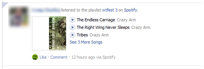 Apps have been around for a while, but rather than being housed in the APPS section of your left hand sidebar these new apps interact with your Timeline in a new way. For example, if you are using Spotify to listen to music and connect with Facebook, what you are listening to is sent and published on your Facebook Timeline. Friends can actually listen along in time to your music! If you see a friend listening to a song just click the little 'Play' arrow and you will join in.