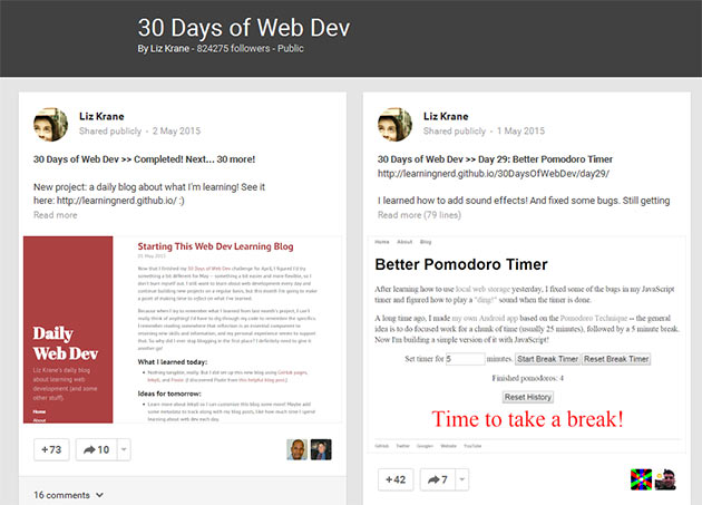This could be because Google intends collections to be used purely by personal accounts for personal accounts. If one thing is for certain it’s that earning a spot as a featured collection is incredible publicity. Let’s take Liz Krane’s featured collection: 30 Days of Web Dev as an example. Liz currently has 824292 followers on Google+. We can either follow Liz’s personal account or the collection itself. The difference being that the only content from Liz that will appear in my news stream will be from the collection I’ve elected to follow. If I follow Liz’ account then obviously each of her posts will appear in stream.