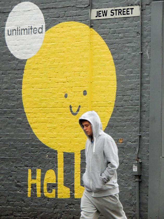 Here’s a good example taken by one of my attendees on the street photography course. Martin Riely had very little photography experience before the course, I love this image, he took everything in and ran with it, he even enjoyed it so much he came back and did another course! He waited a while for this shot, got many images but this is the one. I love the way the young man matches his background, and the way he obliterates the ‘O’ making the sign say hell. It has everything going for it, palette, composition and humour.
