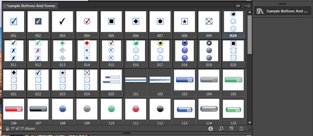 The easiest way to add radio buttons, check boxes, list boxes etc. is to use the Sample Buttons and Forms panel. This allows you to drag and drop pre-designed buttons into your document.