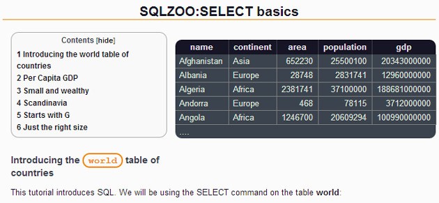 Want to learn about databases? SQLZOO has you covered with 10 sections for learning about SQL.