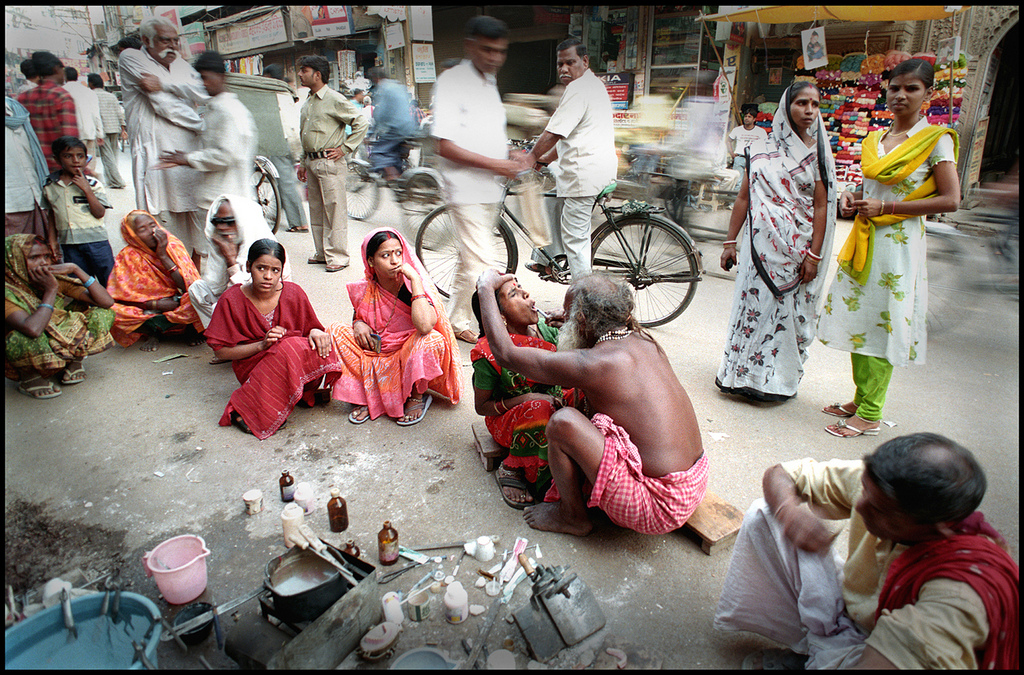 This photograph was taken by Anil Risal Singh at Banaras, India in November 2008: a crowded market place showing a traditional dentist treating his patients on the road side, having many patients waiting in a queue for their turn to come.