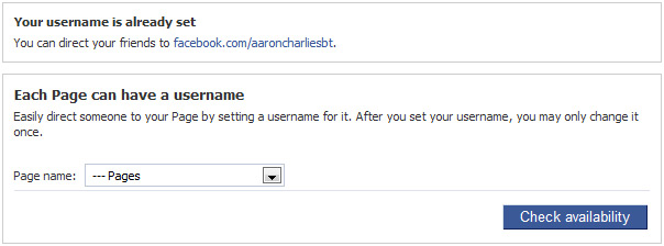 Select the Page you want to set a URL for from the dropdown list (if you've only got one that won't be hard!), enter the page name you want (i.e. what you want to appear at www.facebook.com/XXXX) and hit "Check Availability".