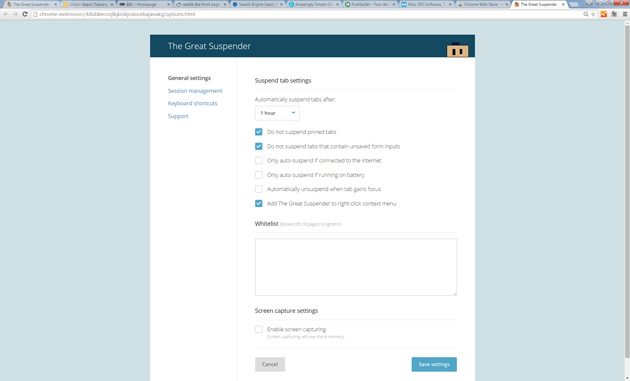 The Great Suspender won’t cure your tab addiction, but it will soothe the symptoms. Fifteen tabs running at one can use as much as 2GB of physical memory. The Great Suspender ‘suspends’ tabs, keeping only essential page elements active and drastically reducing memory usage.