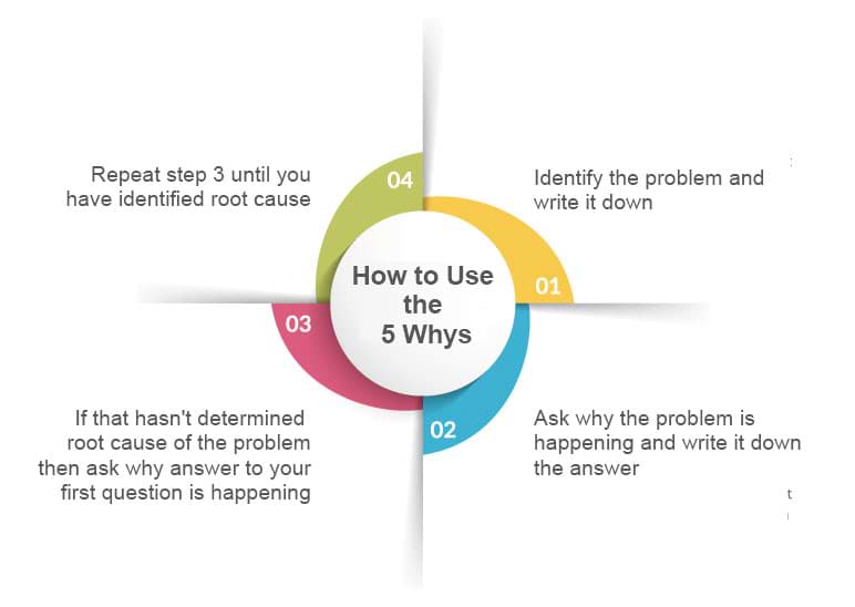 5 has been identified as the optimum number of ways needed to find the root cause of a problem. Most root causes are identified around the 5th question but some more complex problems lead to more questions being asked.