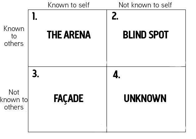 The Façade is large in comparison to the arena and blind spot due to avoided issues or feelings; the individual may have trouble expressing ideas or may simply want to protect themselves. The Unknown is considerably larger than the other panes