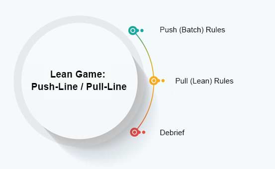 This Lean Game takes around 25-30 minutes to complete. It's purpose is to highlight the advantages of the Lean approach to assembly lines (pull) over the batch approach (push).